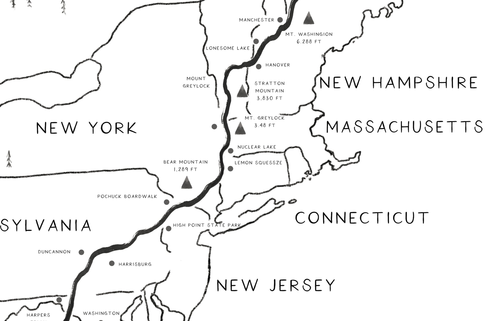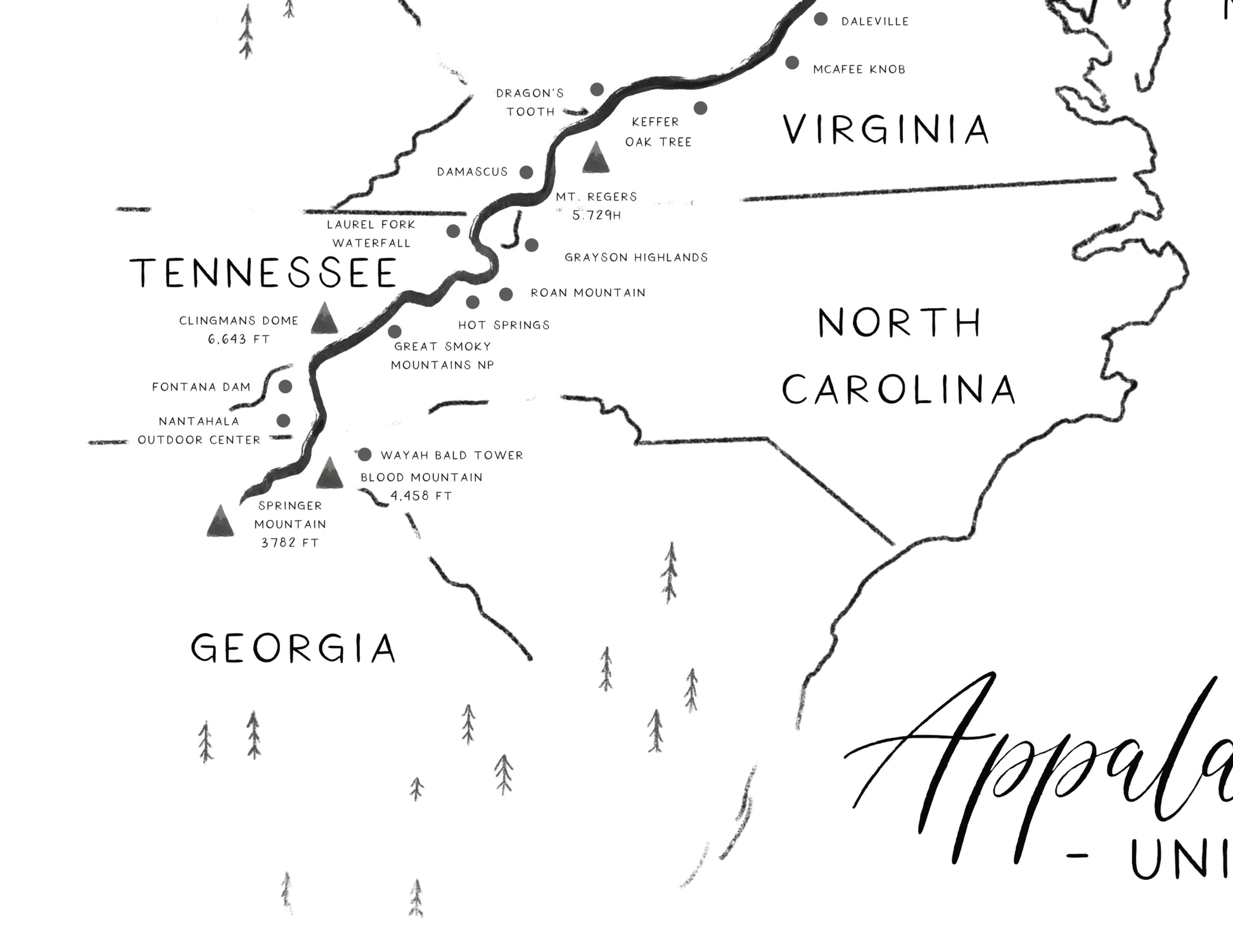 Our Appalachian Trail Map highlights key landmarks along the trail with thoroughly researched names of each significant point and a minimalist style representation of the trail.