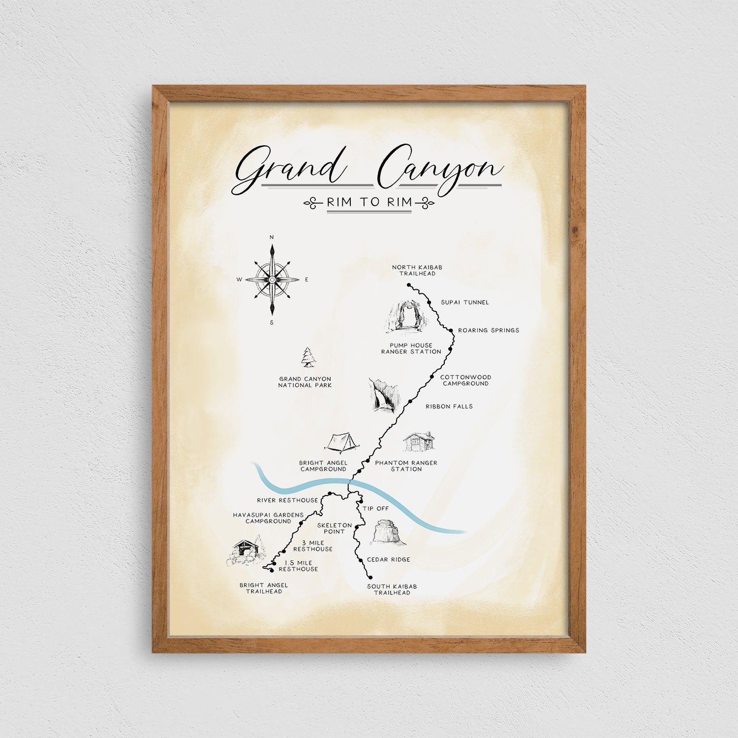 Our Rim to Rim Grand Canyon trail map highlights key landmarks along the trail with detailed illustrations and names of each significant point.